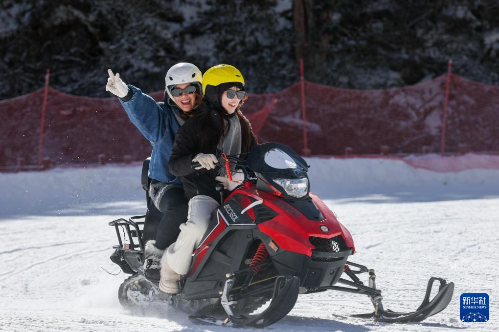 1月5日,在理县毕棚沟滑雪场,两名游客在玩雪地摩托车。
