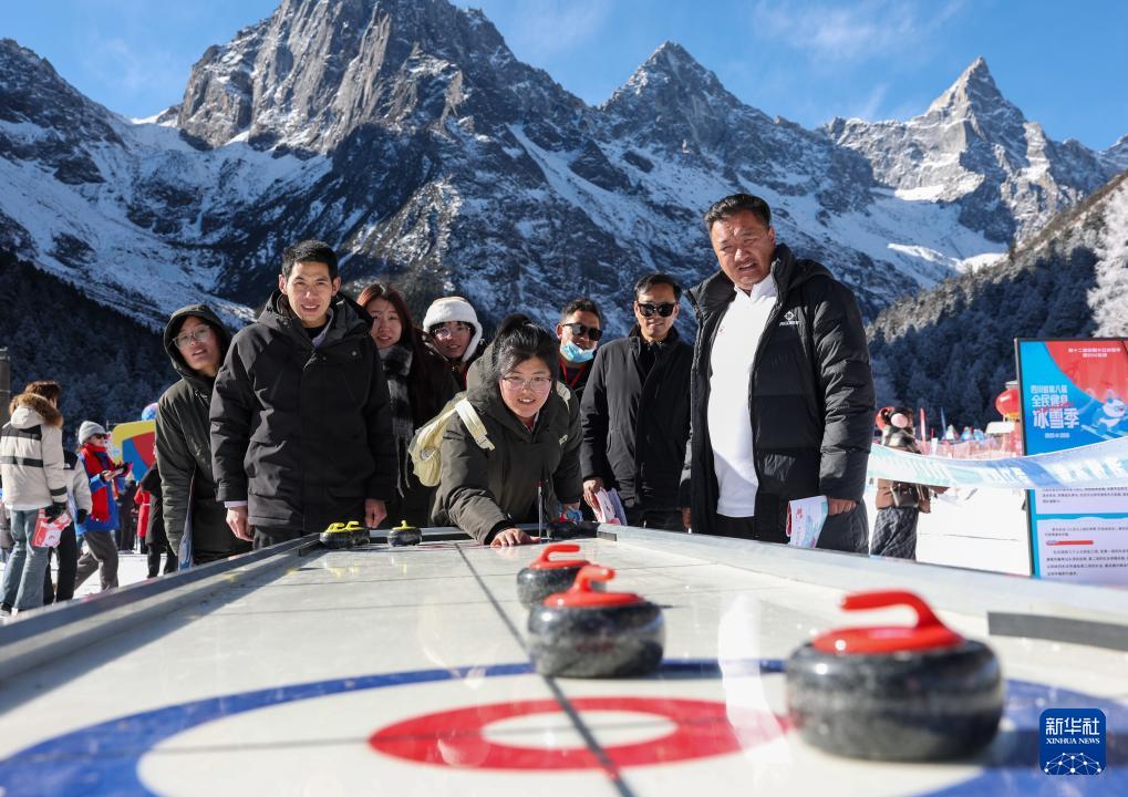1月5日,游客在理县毕棚沟滑雪场里玩桌面冰壶球。
