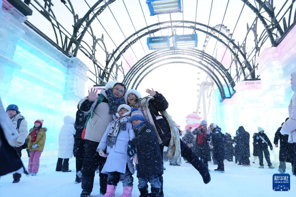 1月5日,游客在哈尔滨冰雪大世界园区游玩、拍照。