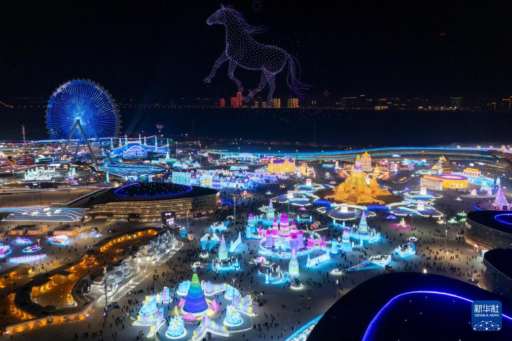 这是1月5日拍摄的哈尔滨冰雪大世界园区的无人机表演(无人机照片)。