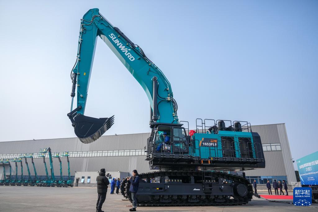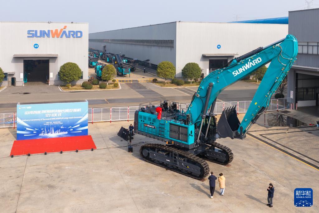这是1月6日在长沙山河工业城拍摄的山河智能SWE1650FLR加长臂挖掘机(无人机照片)。