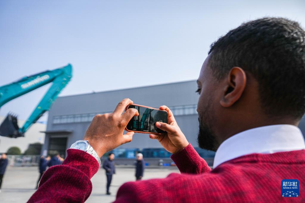 1月6日,在长沙山河工业城,客户代表在拍摄SWE1650FLR加长臂挖掘机。