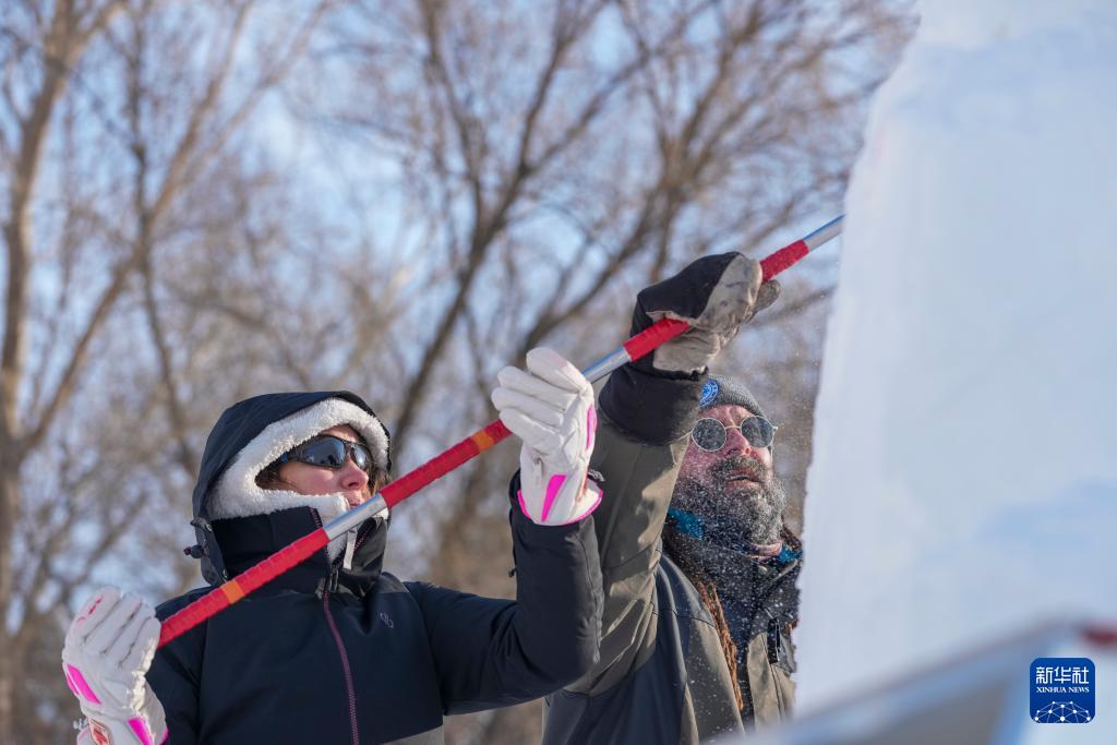 1月6日,在第28届中国·哈尔滨国际雪雕比赛现场,参赛选手创作间隙拍照留影。