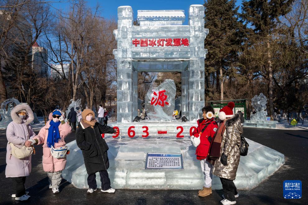 2026年1月5日,游人在第52届哈尔滨冰灯艺术游园会园区留影。