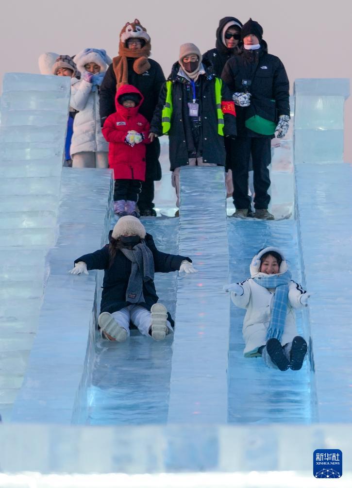 2026年1月5日,游人在哈尔滨冰雪大世界园区玩冰滑梯。