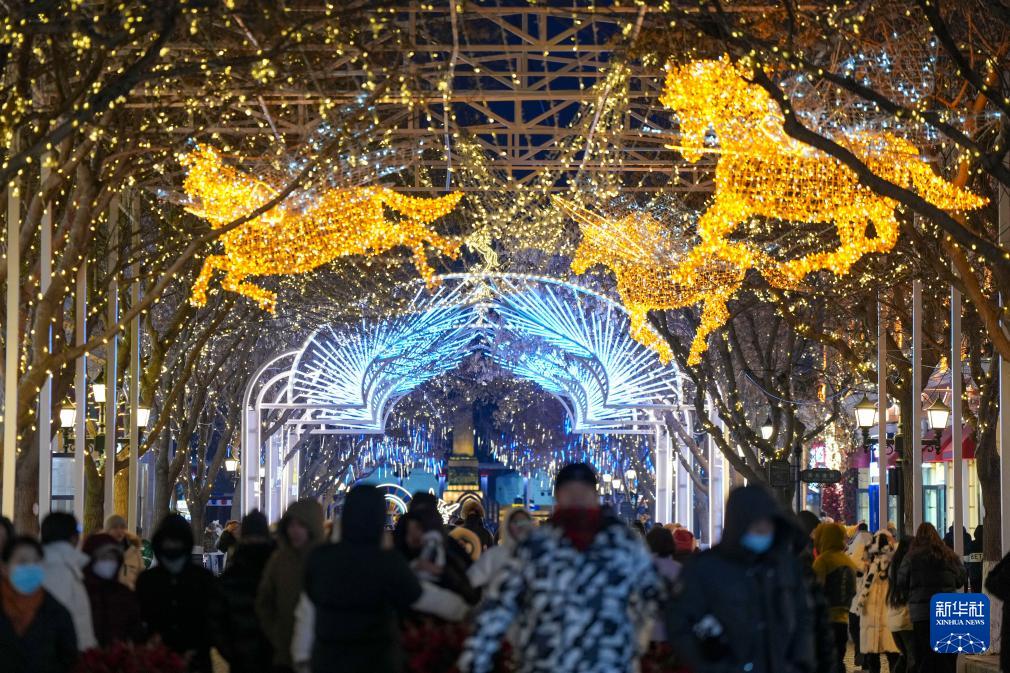 这是哈尔滨中央大街上拍摄的以“冰雪迎宾 瑞马迎新”为主题的创意灯饰(2025年12月16日摄)。