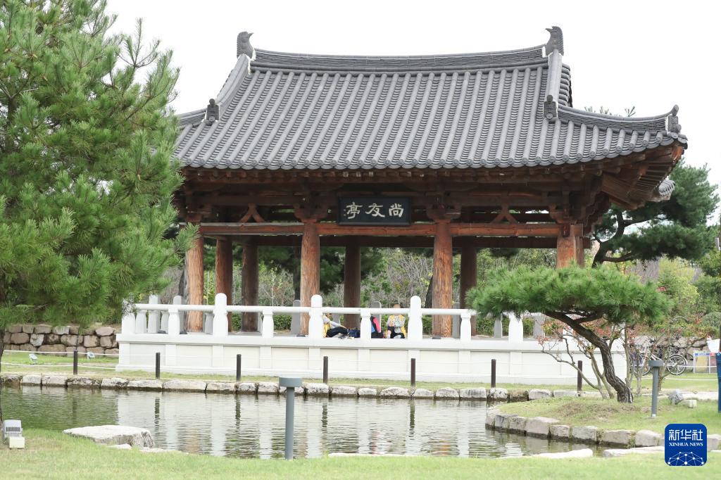 2025年10月17日,市民在韩国庆州的“韩中友好林”公园里的尚友亭休息。