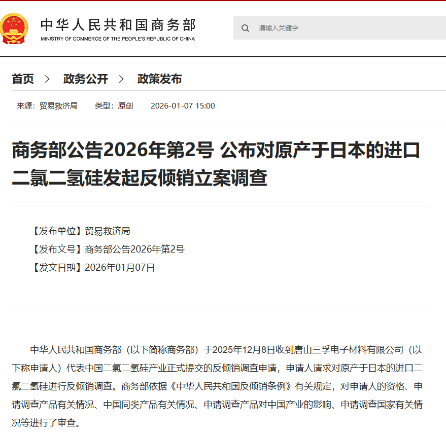 商务部公告2026年第2号 公布对原产于日本的进口二氯二氢硅发起反倾销立案调查