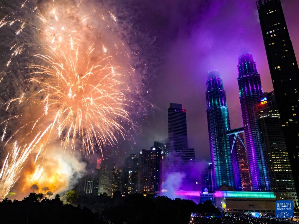 2026年1月1日凌晨,新年烟花在吉隆坡的马来西亚国家石油公司双塔旁绽放(无人机照片)。