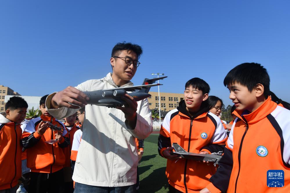 1月7日,在融水苗族自治县民族中学,西北工业大学研究生支教团成员宋述钰(左一)在非遗课堂上与学生交流。