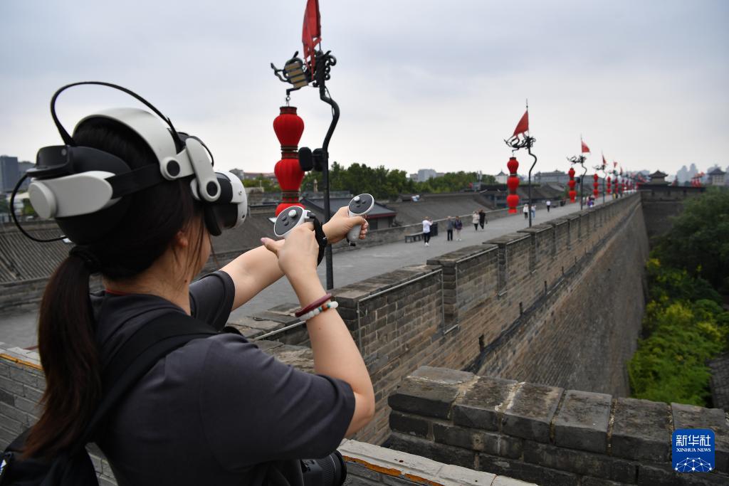 游客在西安城墙一处马面上体验一款以射箭守城为主题的MR混合现实游戏(2025年9月10日摄)。