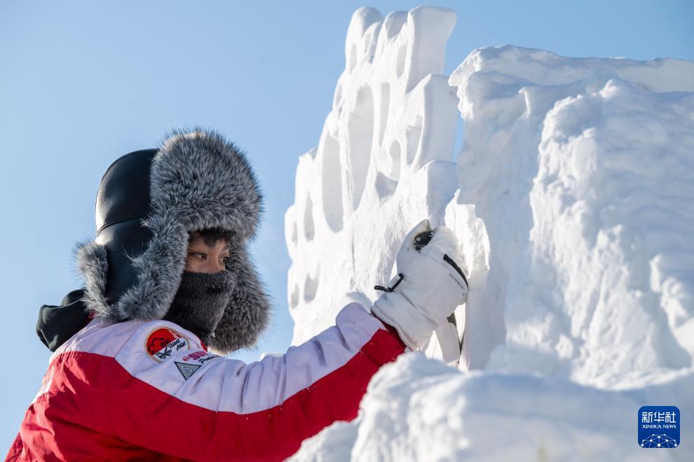 1月7日,在哈尔滨太阳岛雪博会第28届中国·哈尔滨国际雪雕比赛现场,选手在进行雪雕创作。