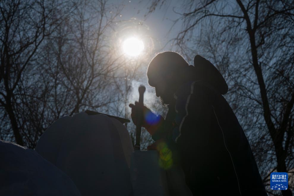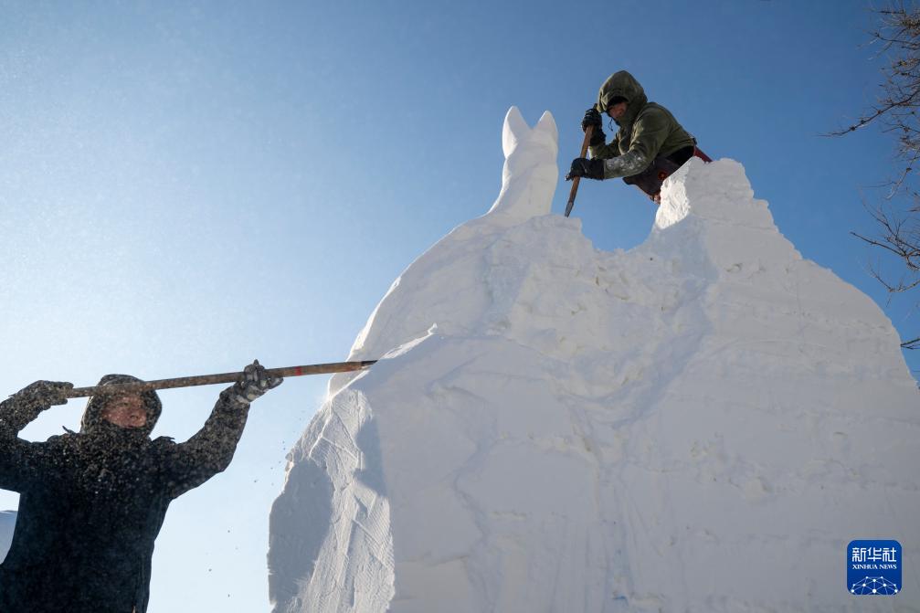 1月7日,在哈尔滨太阳岛雪博会第28届中国·哈尔滨国际雪雕比赛现场,选手在进行雪雕创作。