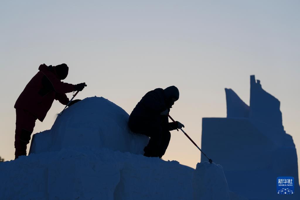1月7日,在哈尔滨太阳岛雪博会第28届中国·哈尔滨国际雪雕比赛现场,选手在进行雪雕创作。