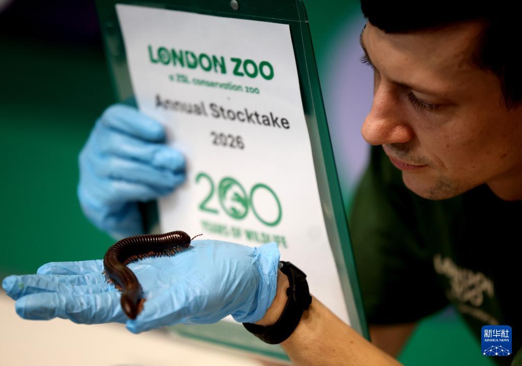 1月6日,在英国伦敦动物园,一名工作人员对千足虫进行盘点。