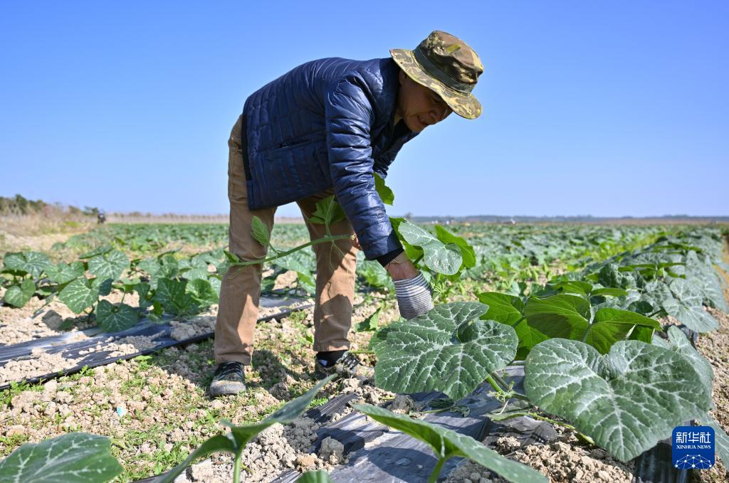 1月8日,农民在海南省澄迈县瑞溪镇罗浮洋蔬菜种植基地对南瓜田进行管护。