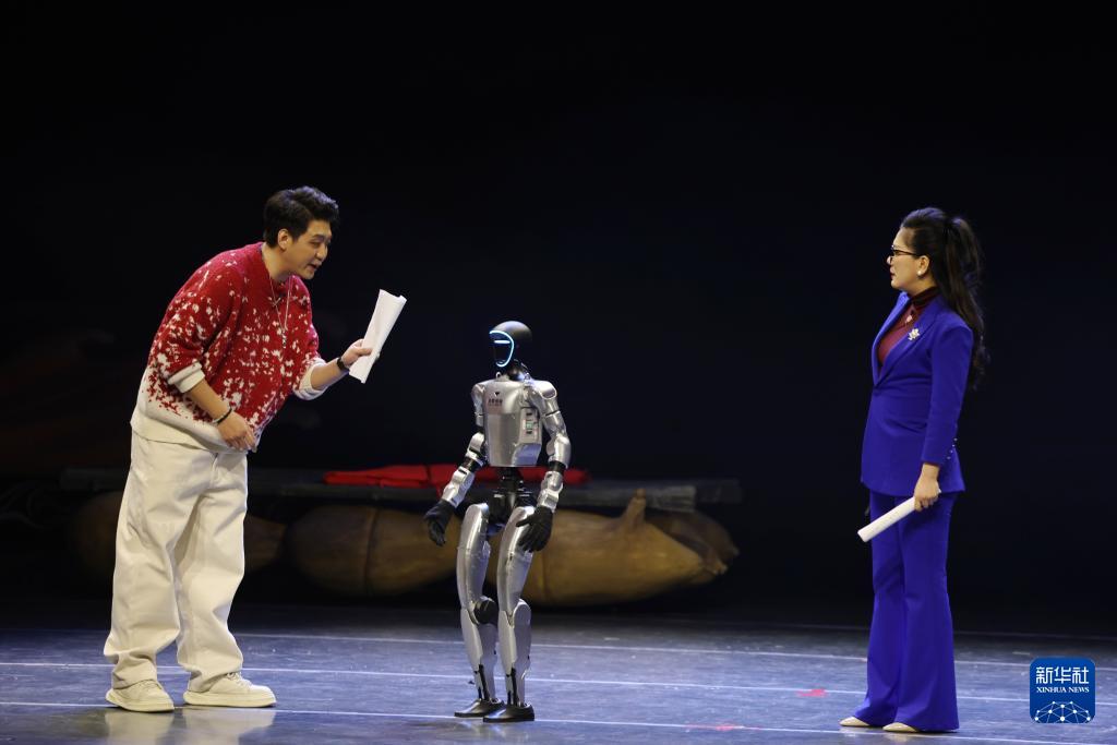 主持人在甘肃省群众文艺展演展播活动首场演出中和机器人互动(1月7日摄)。