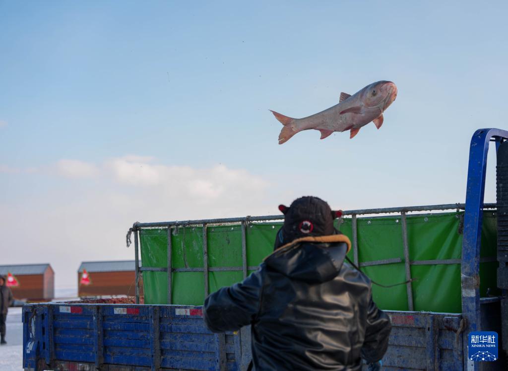 1月7日,在吉林省松原市,渔民将刚捕捞的大鱼装进车里。