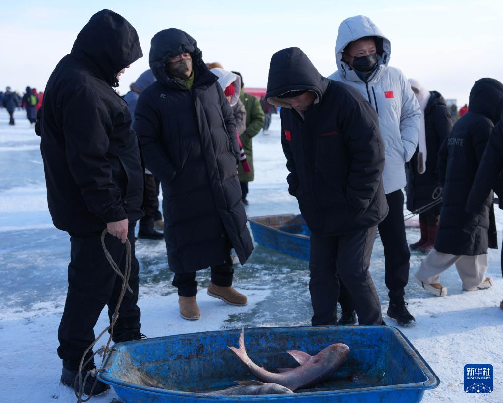 1月7日,在吉林省松原市,游客在冰面上挑选刚捕捞出的大鱼。