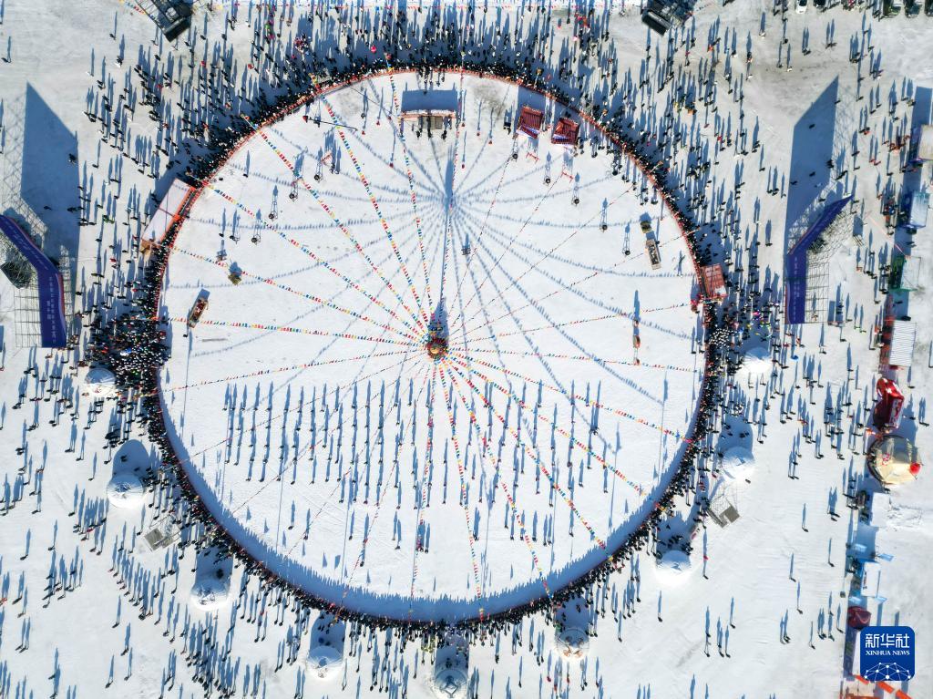 1月8日,在吉林省松原市,人们参加吉林·查干湖第24届冰雪渔猎文化旅游节开幕式(无人机照片)。