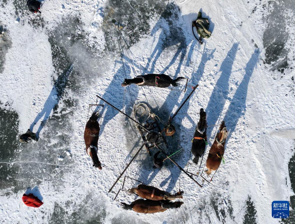 1月7日,在吉林省松原市,渔民赶马拉动绞盘,将渔网从冰面拉出。