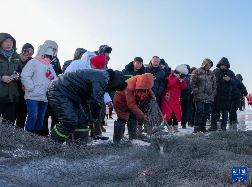 1月7日,在吉林省松原市,游客在查干湖冰面上观看冬捕。