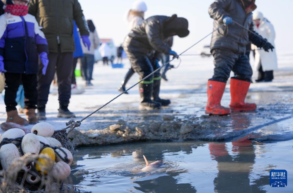 1月7日,在吉林省松原市,渔民将渔网拽出冰面。