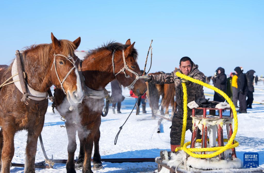 1月7日,在吉林省松原市,渔民将马拴到拉动渔网的绞盘上。