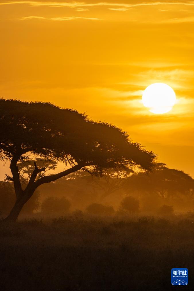 这是1月8日在肯尼亚安博塞利国家公园拍摄的日出景观。