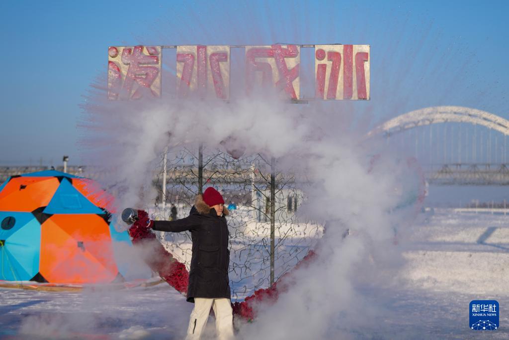 1月10日,游客在松花江哈尔滨段江面上体验“泼水成冰”。