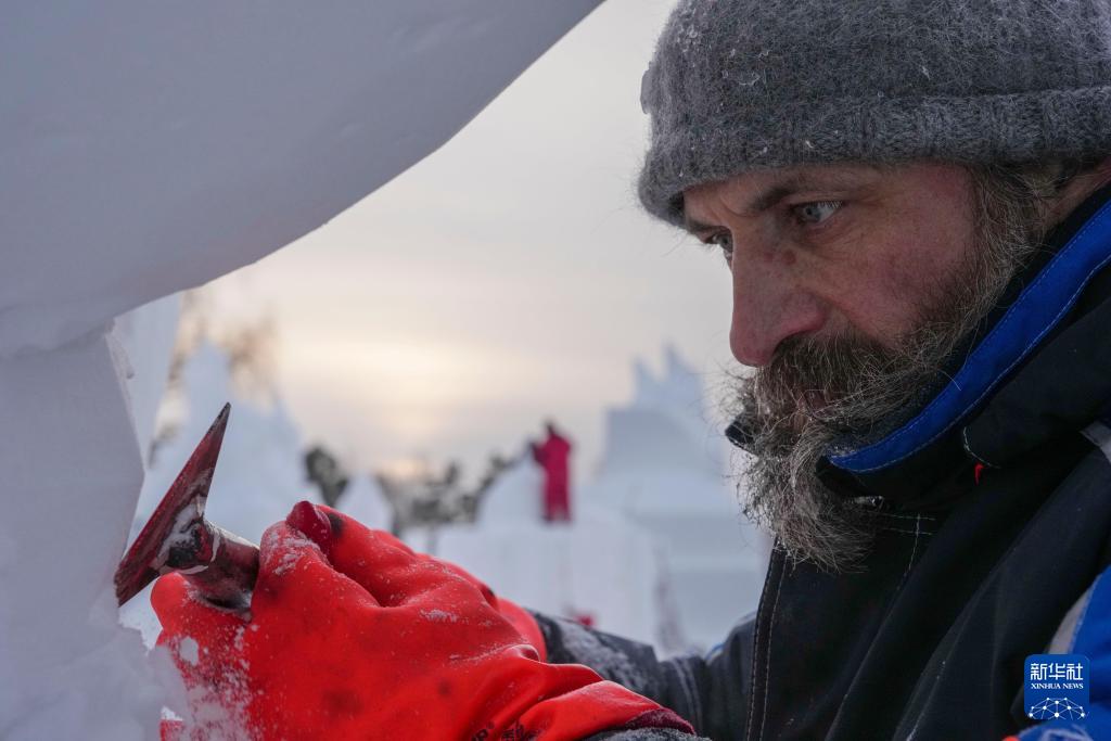 1月8日,俄罗斯哈巴罗夫斯克二队参赛选手在进行雪雕作品《单恋》的创作,作品最终获一等奖。