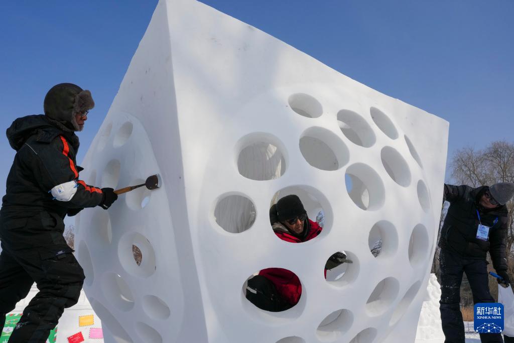 1月9日,韩国队参赛选手在进行雪雕作品《扩展+空间》收尾工作,作品最终获二等奖。
