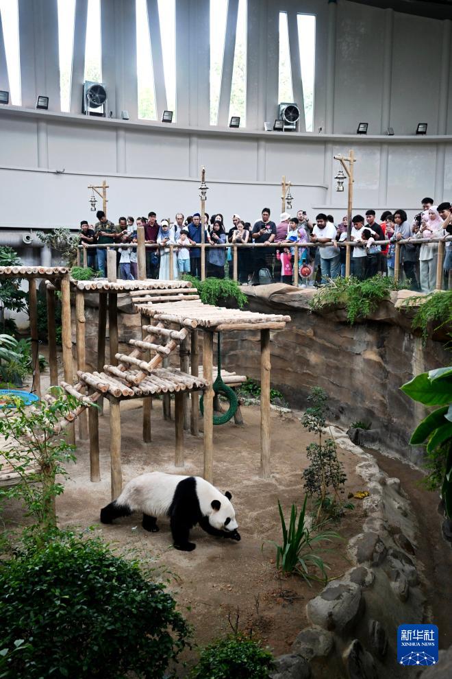 大熊猫“辰星”“晓月”10日在马来西亚国家动物园大熊猫保护中心正式与马来西亚公众见面。两只憨态可掬的大熊猫吸引众多民众前来参观,现场气氛热烈。