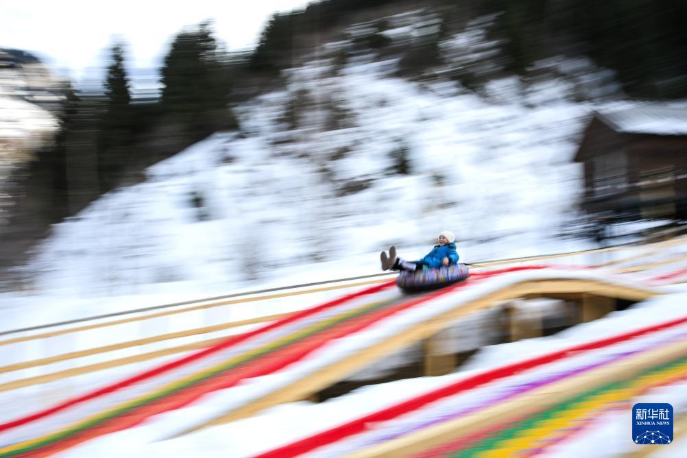 1月11日,在哈萨克斯坦阿拉木图市郊,一名儿童体验冰雪滑梯。