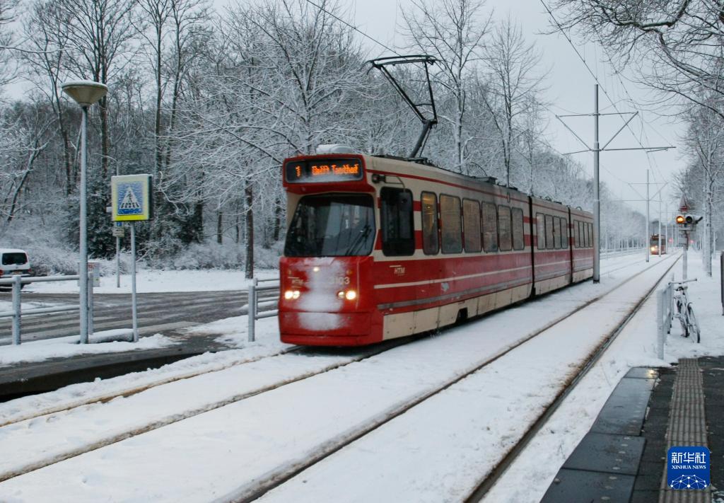 1月7日,在荷兰海牙,一辆电车在积雪轨道上行驶。