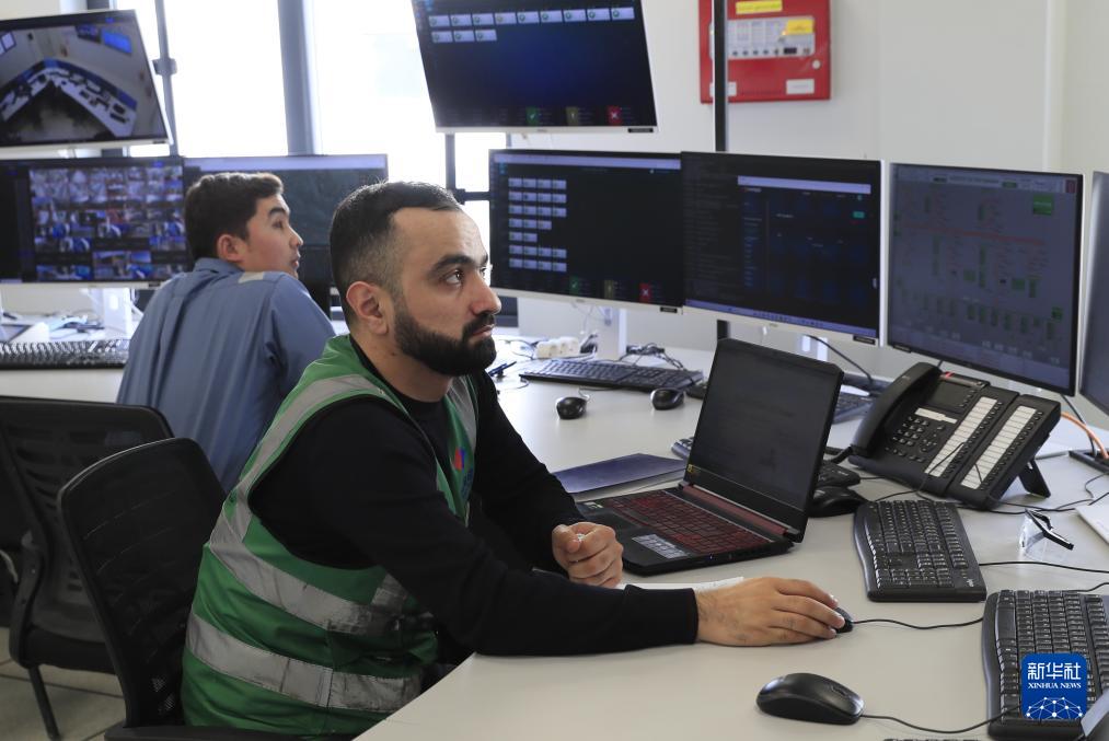 1月8日,在阿塞拜疆的希济-阿普歇伦风电项目现场,技术人员在控制中心监控风机和相关设备运行情况。
