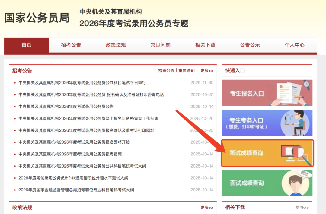 2026年国考笔试成绩刚刚发布!笔试成绩查询入口已开通,考生可登录国家公务员局中央机关及其直属机构2026年度考试录用公务员专题网站,查询笔试成绩和合格分数线,点击“笔试成绩查询”按钮凭借身份证及准考证进行查询。