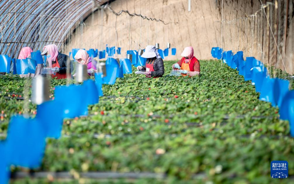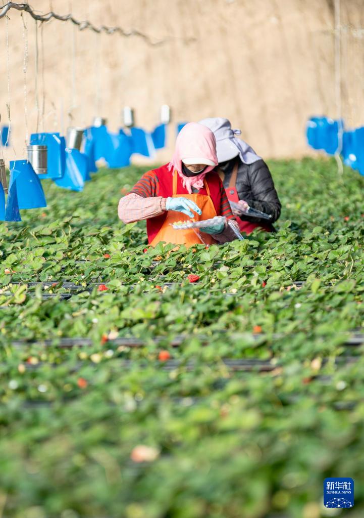 1月15日,农民在位于宁夏银川市贺兰县习岗镇的新平村设施园区草莓温棚内采摘草莓。