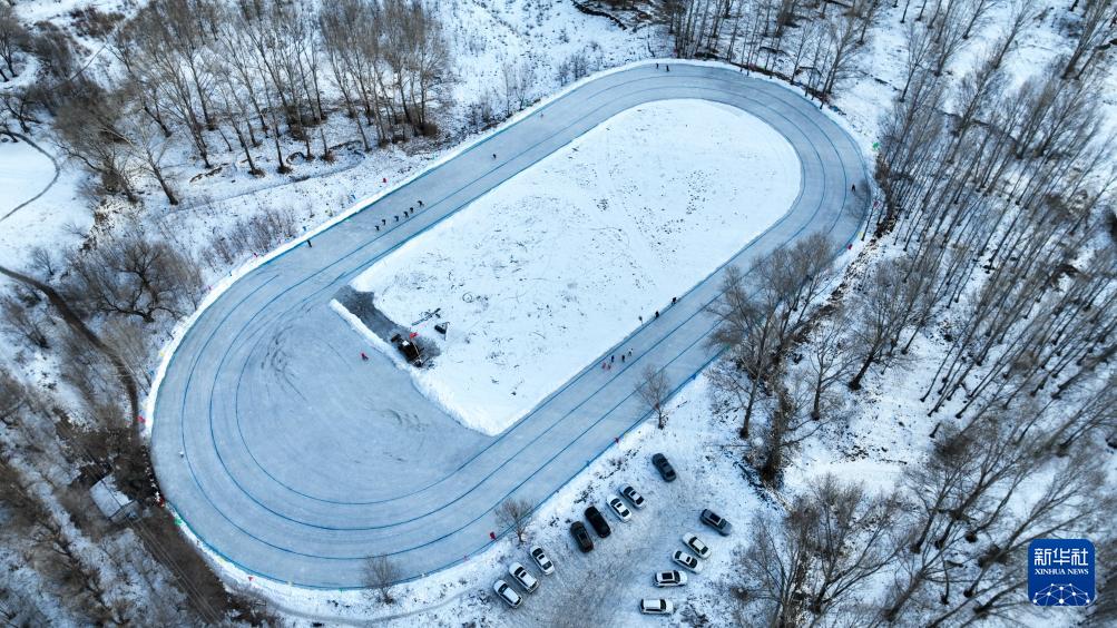 1月18日,市民在内蒙古呼伦贝尔扎兰屯市一处冰场滑冰(无人机照片)。