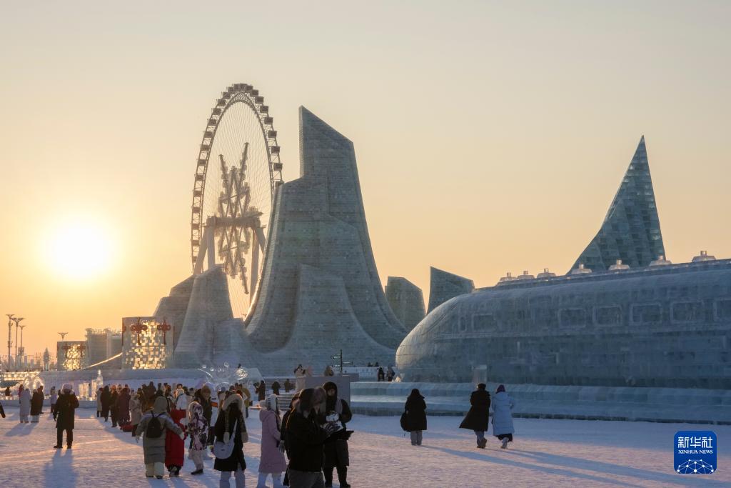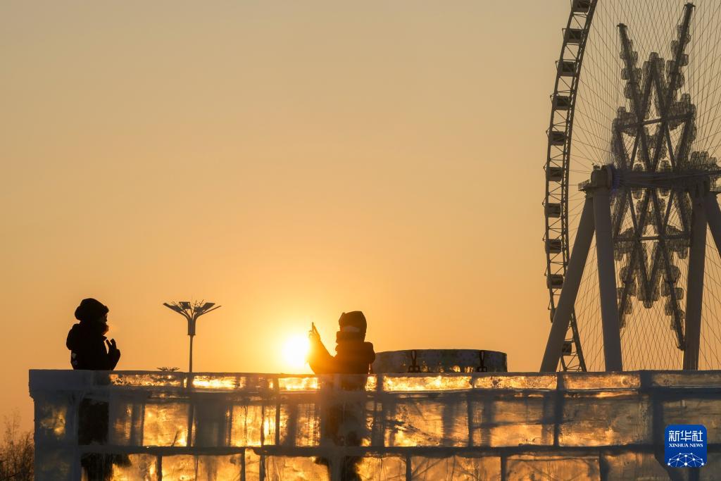 夕阳西下,落日余晖为哈尔滨冰雪大世界披上暖金霞光,游客尽享冬日的浪漫与温柔。