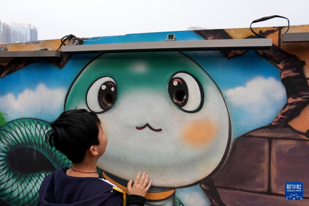 1月17日,一名小朋友在永州市体育场外体验“洞票”。