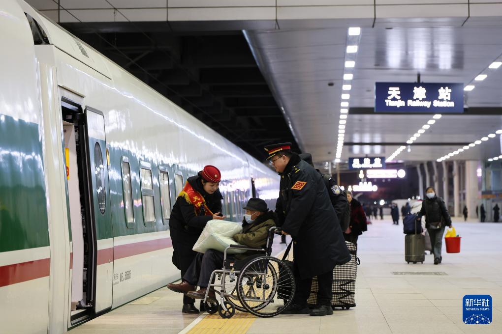 1月19日,铁路工作人员在天津站服务重点旅客上车。