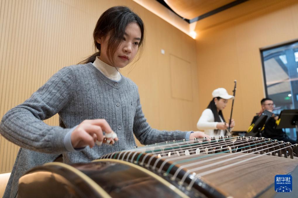 1月19日,在苏州市工人文化宫的职工音乐厅,一名苏州市职工艺术团繁星乐团的成员在练习古筝。