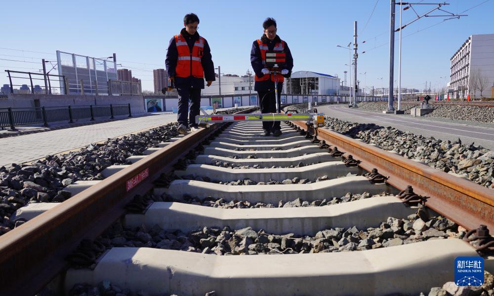 1月20日,中国铁路北京局集团有限公司北京高铁工务段的工作人员在使用轨道检查仪进行作业。