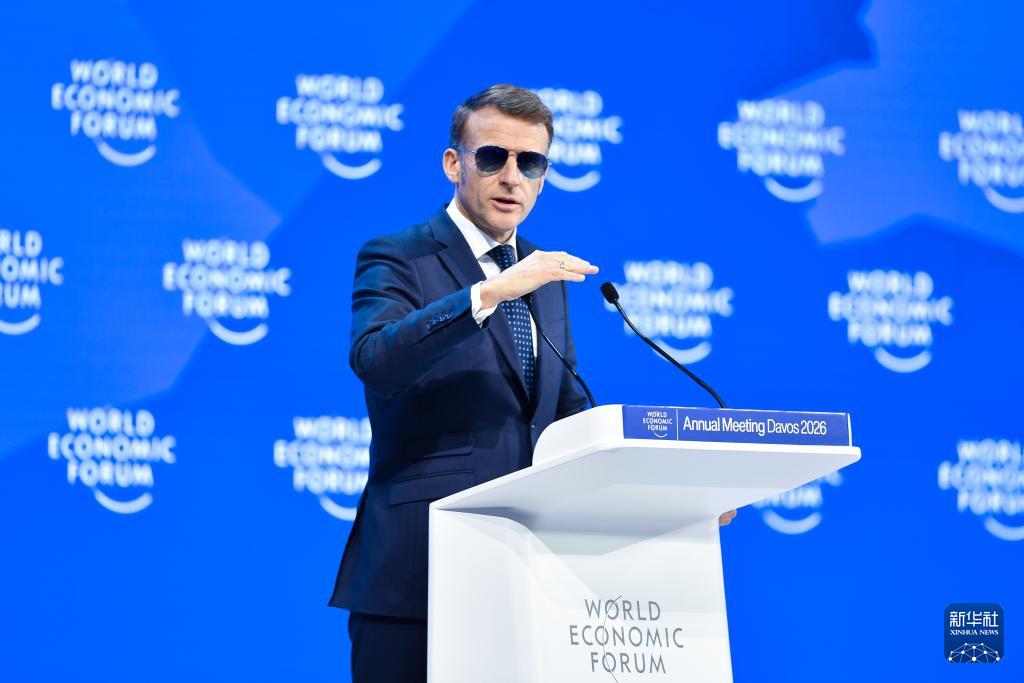 1月20日,法国总统马克龙在瑞士达沃斯举办的世界经济论坛2026年年会上讲话。