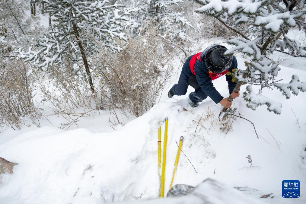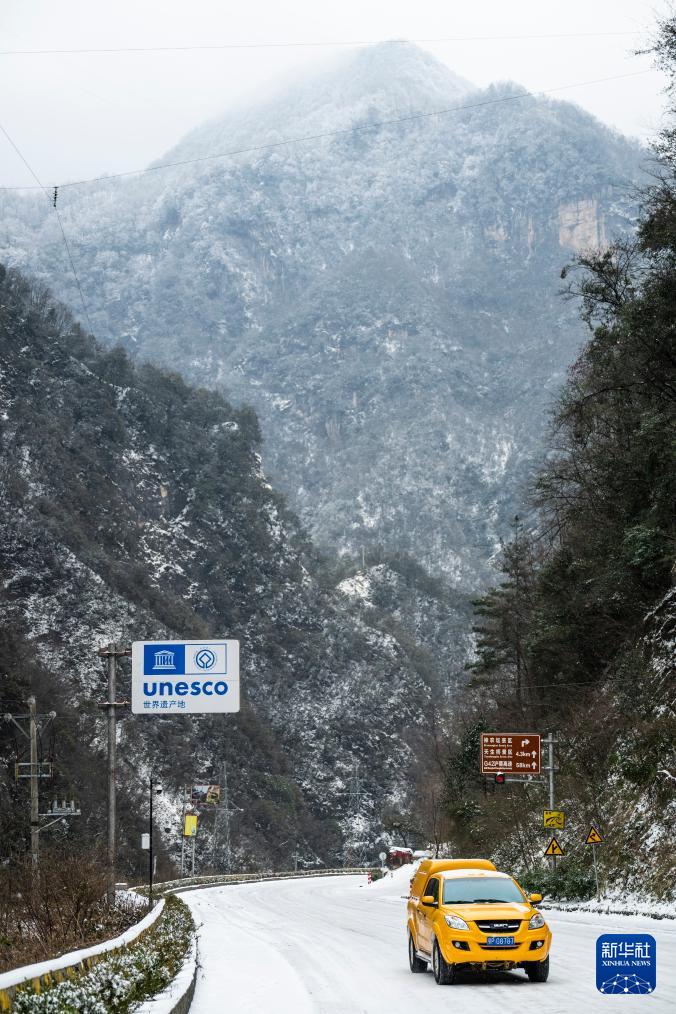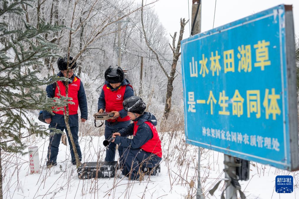 1月21日,在神农架林区木鱼镇,木鱼供电所运维人员在极端天气线路特巡特护途中。