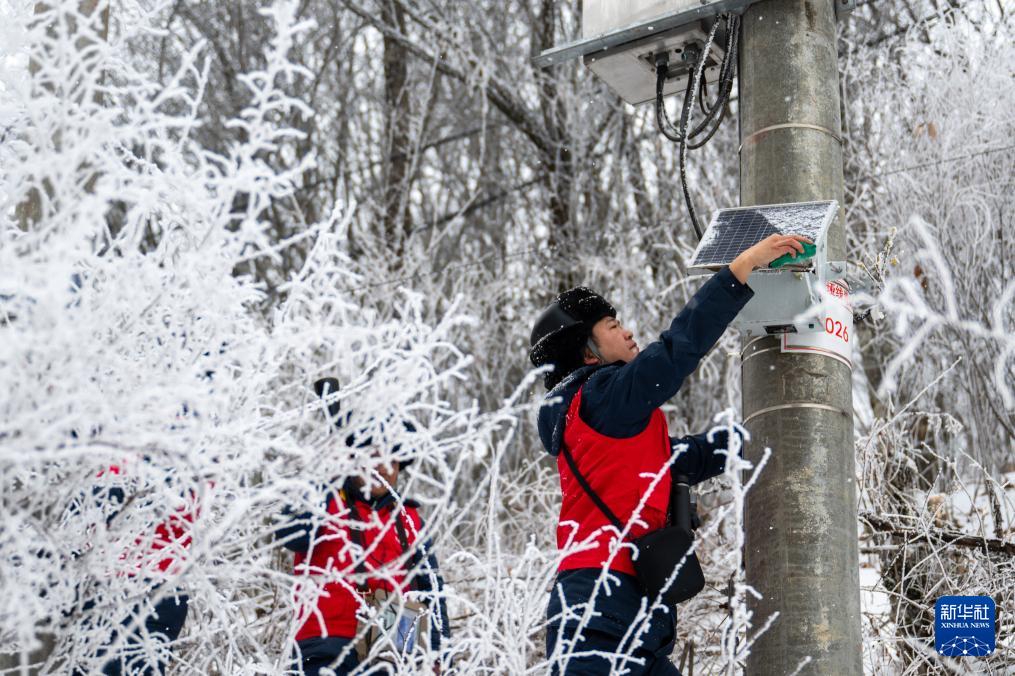 1月21日,在神农架林区木鱼镇,木鱼供电所运维人员擦拭架空线路故障指示器光伏板。
