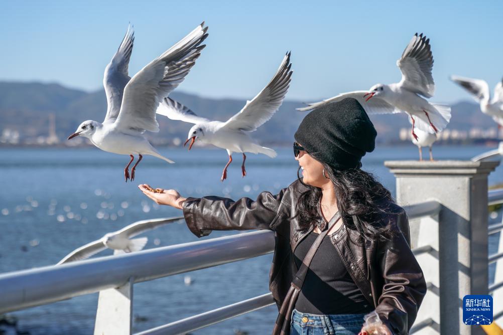 1月22日,游客在滇池畔喂红嘴鸥。