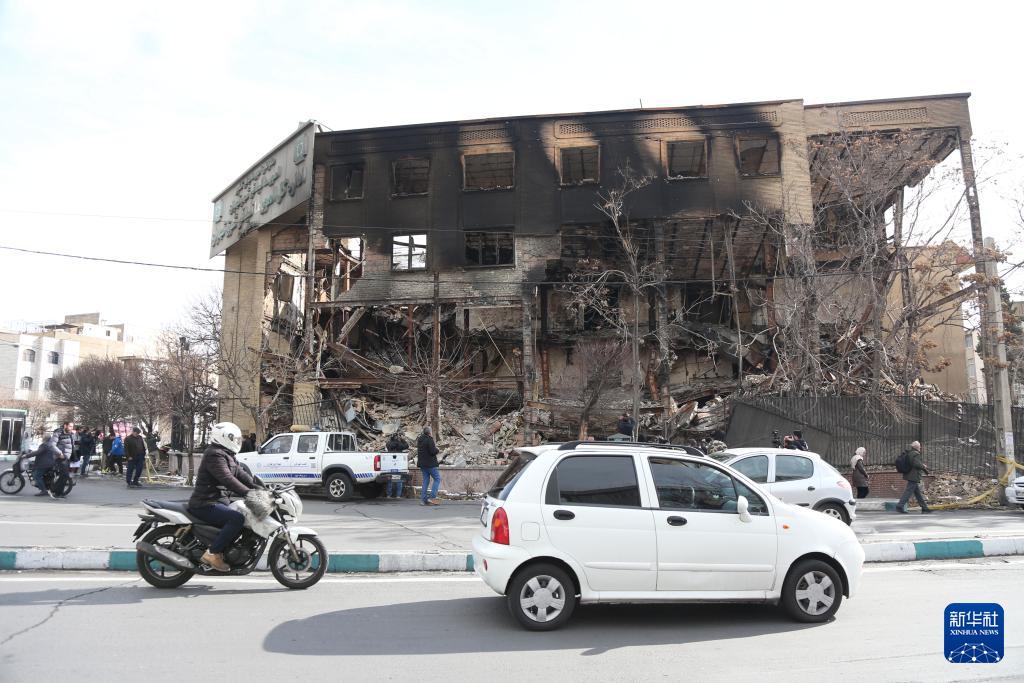 1月21日,在伊朗首都德黑兰,车辆经过在近期骚乱中受损的一处税务局建筑。