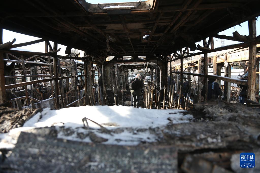1月21日,在伊朗首都德黑兰,一名男子站在一辆于近期骚乱中被烧毁的公交车内。